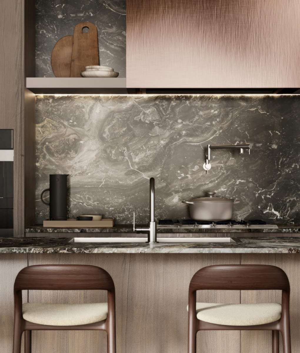 The project offers refined 1, 2, and 3-bedroom homes with ceiling heights ranging from 9 to 11 feet and premium finishes.