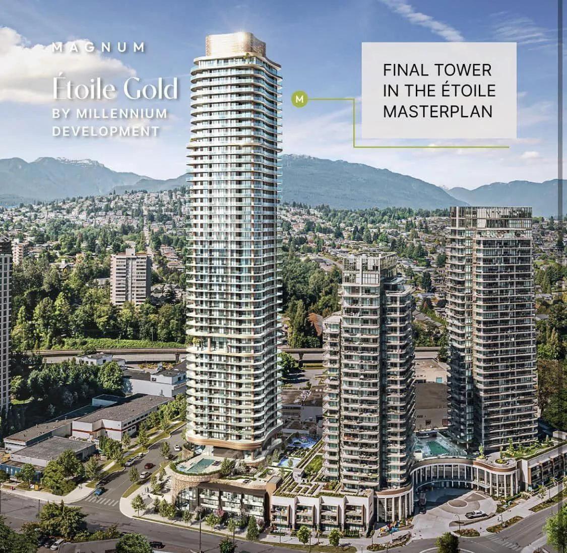 Étoile Gold is a luxury 47-storey residential condominium tower developed by Millennium Development Group, located at 2266 Springer Ave, Burnaby, BC in the highly desirable Brentwood neighbourhood. The project blends elegant design with high-end amenities including concierge service, fitness and wellness facilities, indoor pool and social spaces. Residents enjoy a range of indoor and outdoor lifestyle features such as lounges, entertainment rooms, garden terraces, BBQ areas, and convenient parking with EV-ready stalls and storage lockers. Strategically positioned near transit, shopping and dining, Étoile Gold offers premium urban living with a focus on comfort and community.