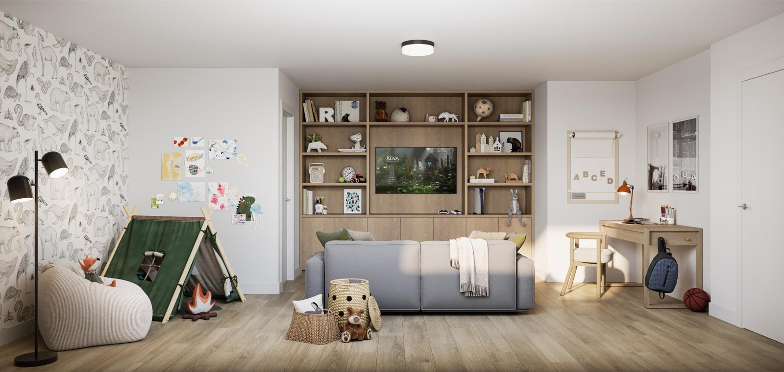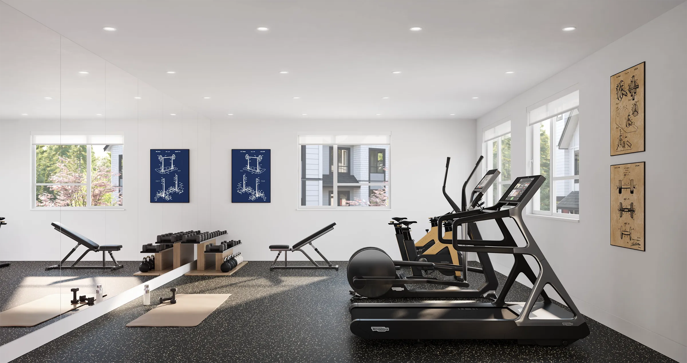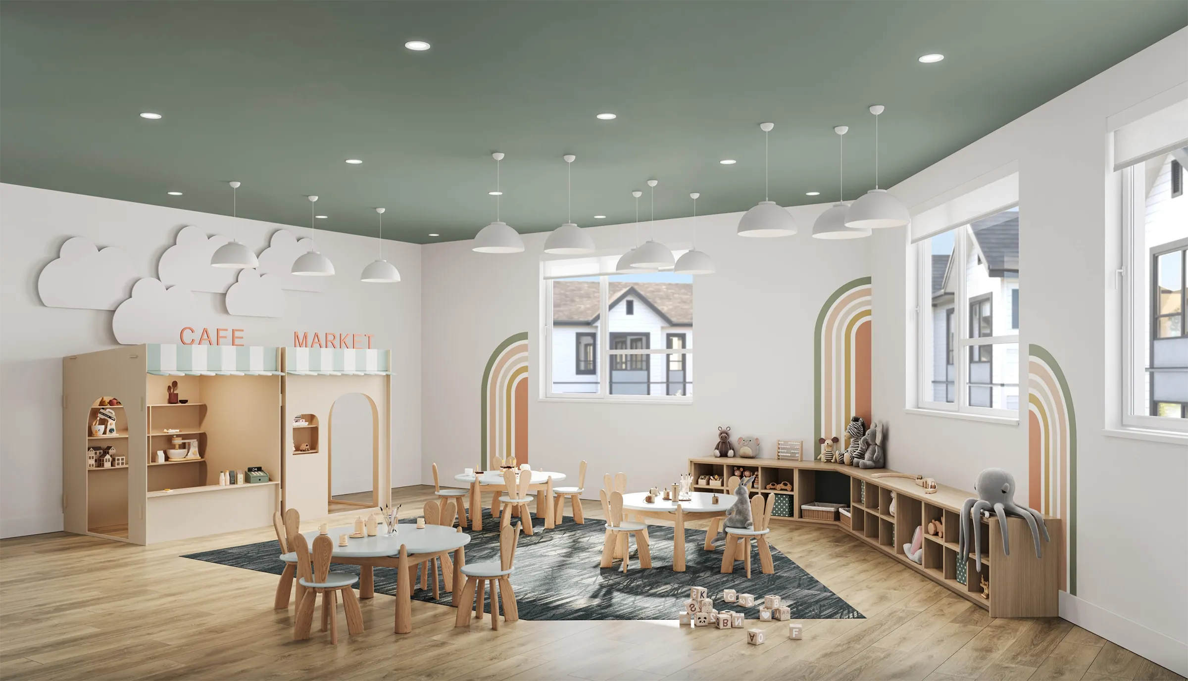 The community offers a lounge, fitness facility, indoor and outdoor children’s play areas, and a multi-purpose room for activities such as yoga and meditation.