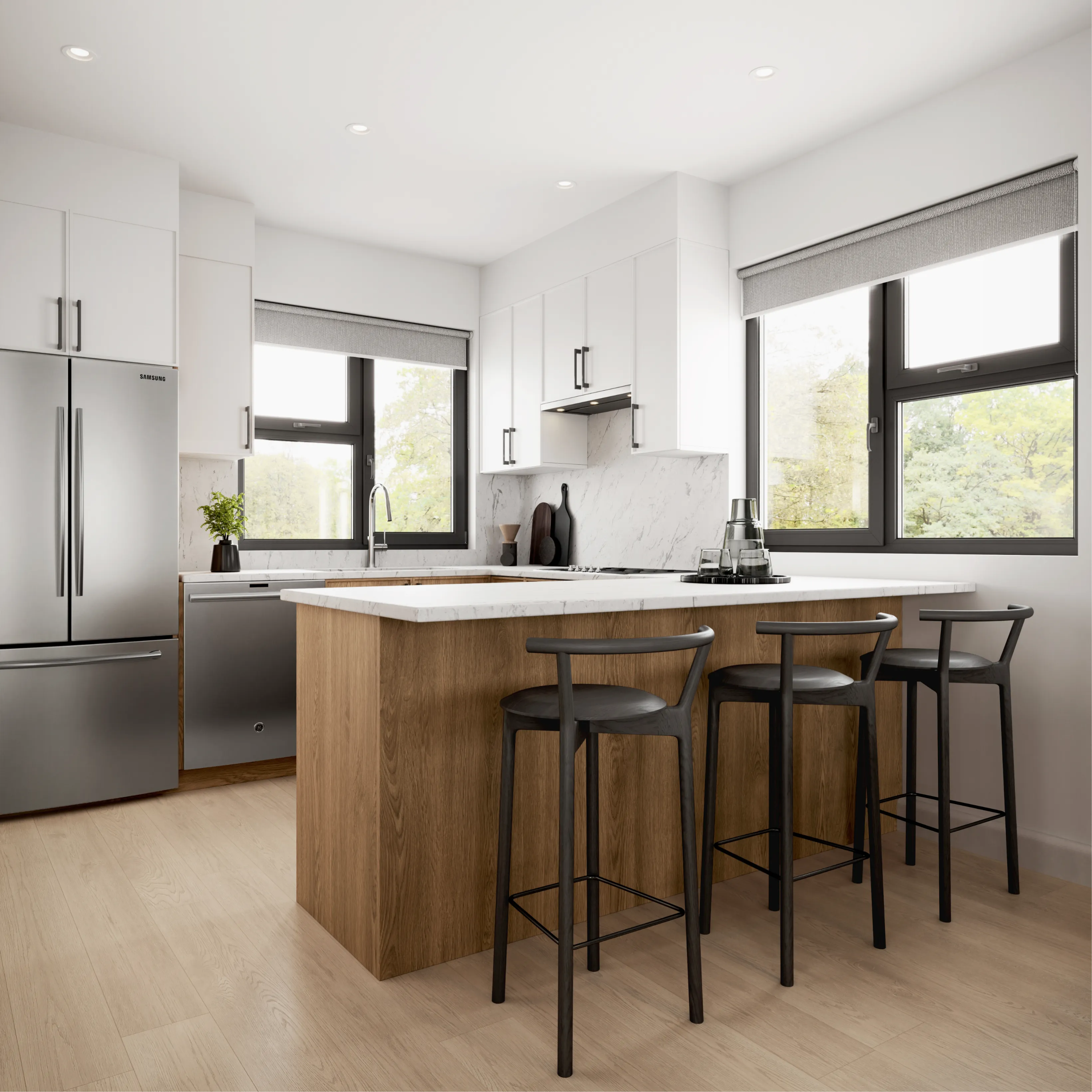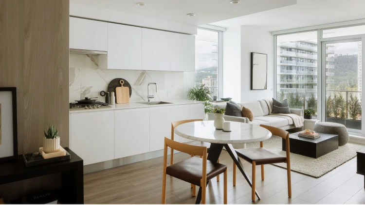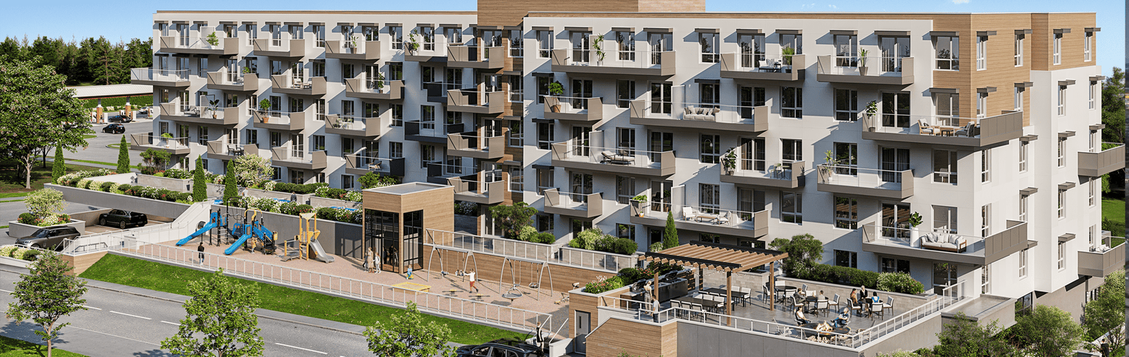 The project offers modern condominium homes with underground parking, including EV charging in every parking stall, and features ground-level commercial space that enhances everyday convenience.